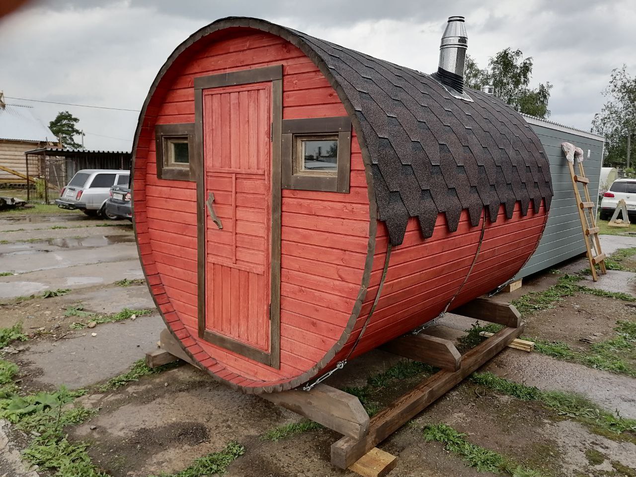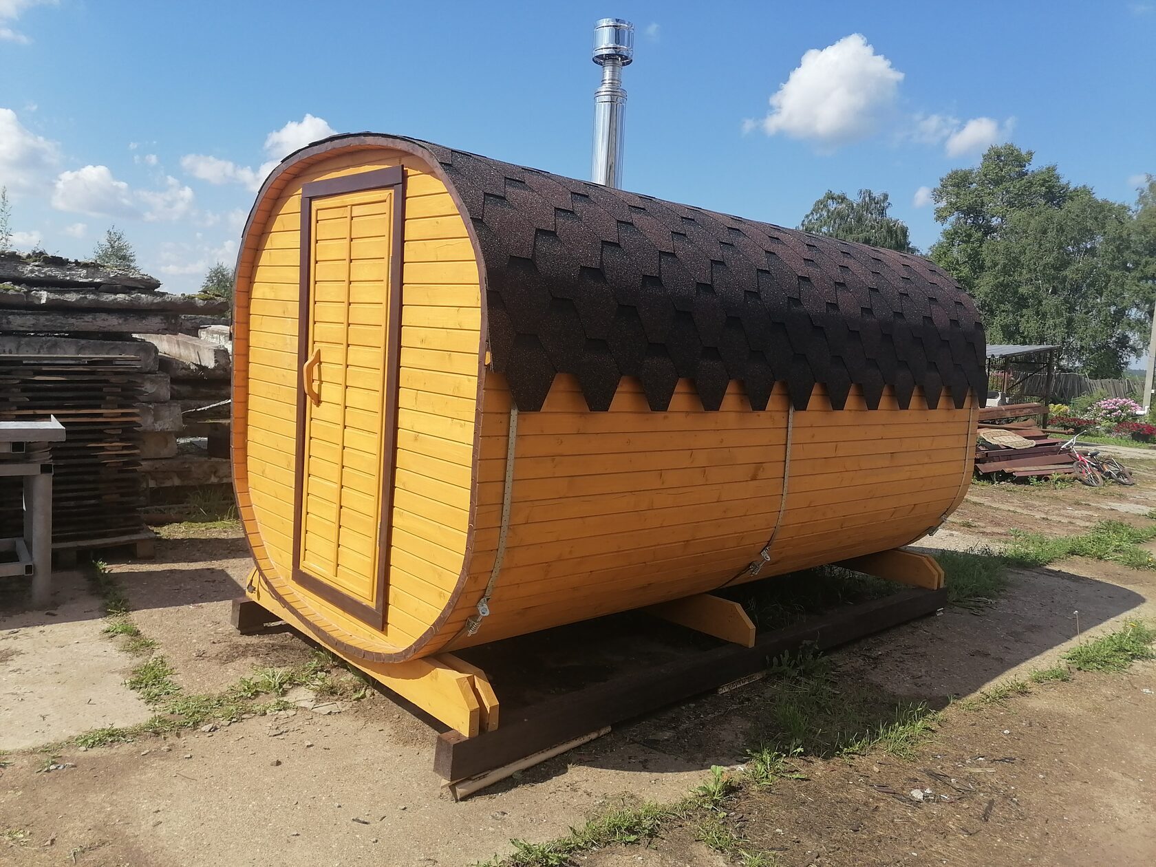 Изготовлена из высококачественной древесины, тщательно обработана специальным составом. Установлена печь от производителя.